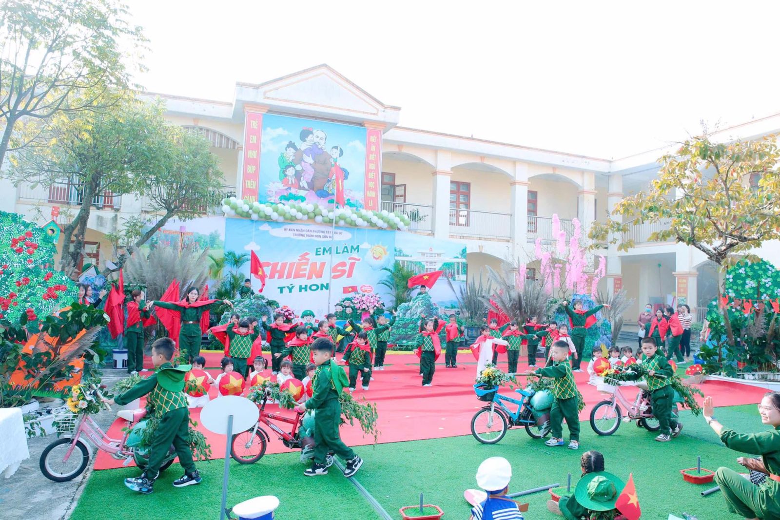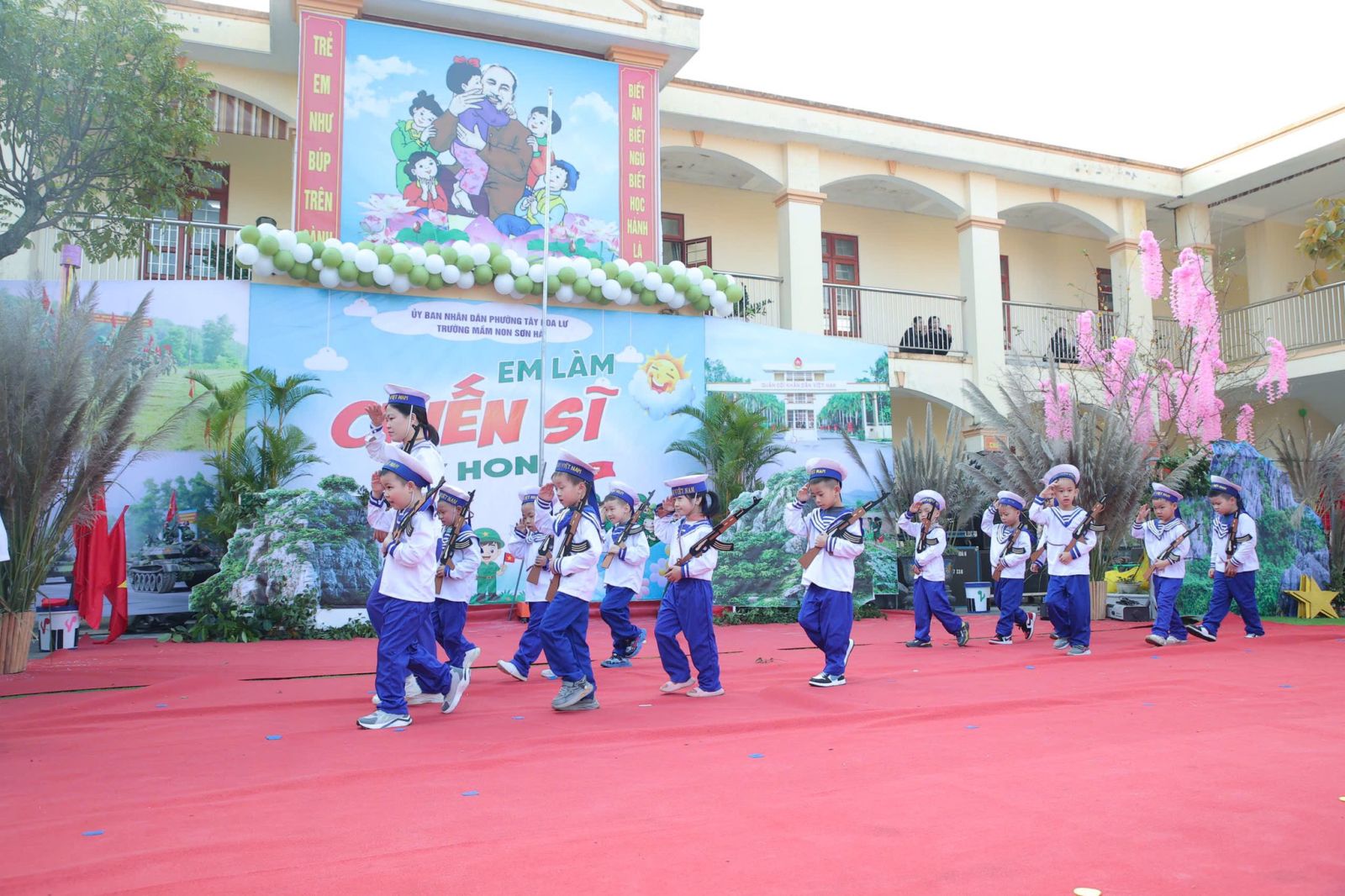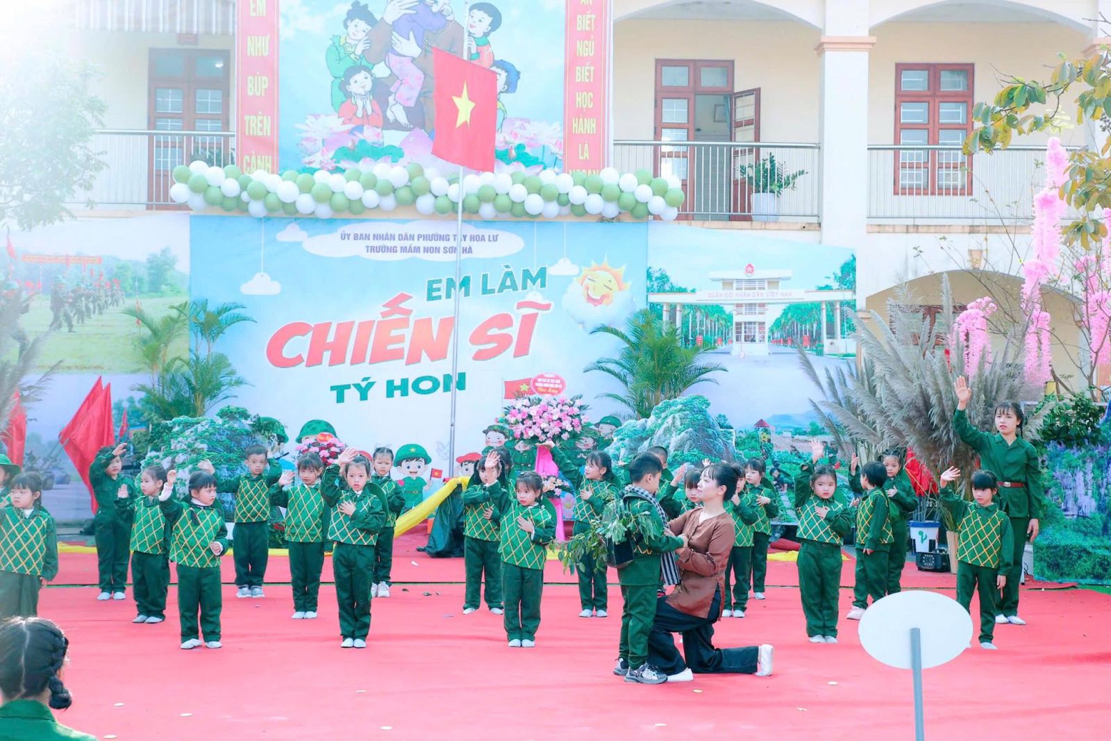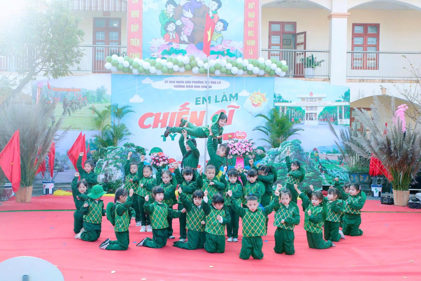Sáng nay ngày 19/12/2025, trong không khí vui tươi và đầy tự hào hướng tới kỷ niệm 81 năm ngày thành lập Quân đội Nhân dân Việt Nam. Được sự nhất trí của UBND Phường Tây Hoa Lư, hôm nay cô và trò Trường mầm non Sơn Hà long trọng tổ chức chương trình CHIẾN SĨ TÝ HON , nhằm tạo ra một sân chơi lành mạnh bổ ích và lí thú cho các bé, nơi các bé được hóa thân thành những chiến sĩ dũng cảm, mạnh mẽ, tự tin và kỷ luật