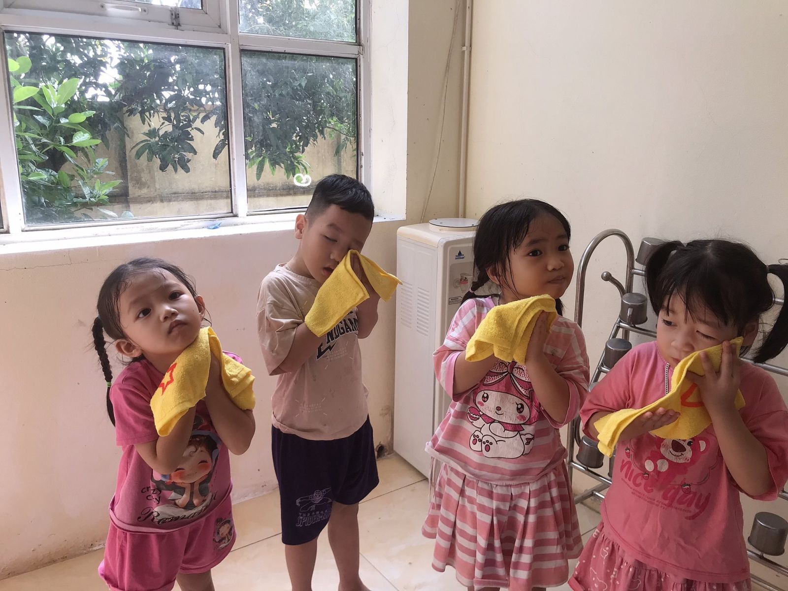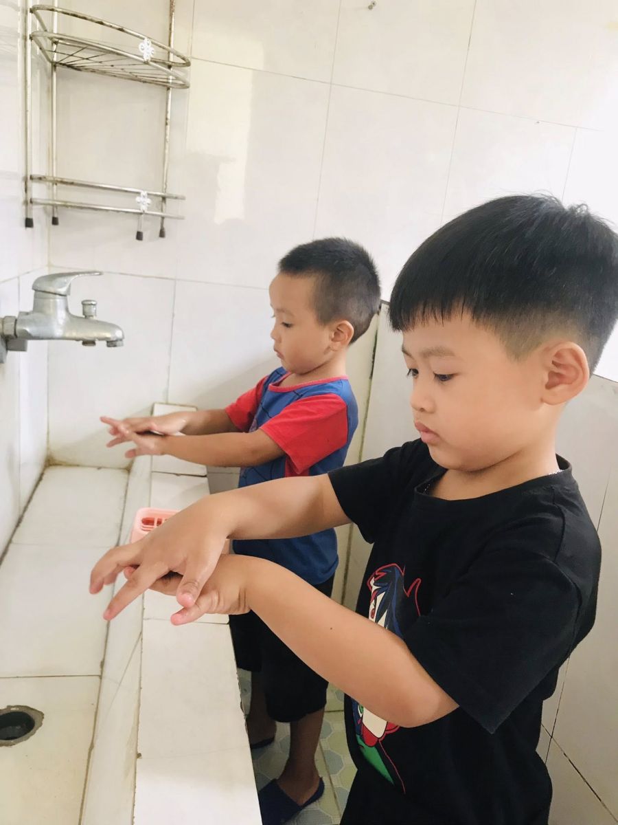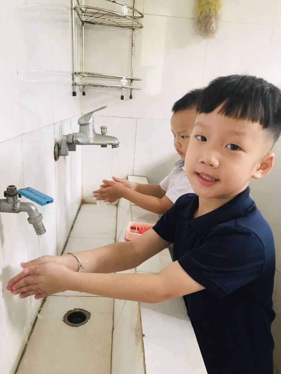 Không chỉ chú trọng dinh dưỡng, nhà trường còn đặc biệt quan tâm đến thói quen vệ sinh cá nhân của trẻ. Trước khi ăn và sau khi đi vệ sinh, các bé được cô giáo hướng dẫn rửa tay bằng xà phòng dưới vòi nước sạch, lau khô bằng khăn riêng. Đồng thời, các con còn được hướng dẫn rửa mặt, vệ sinh cá nhân sạch sẽ giúp gương mặt luôn tươi sáng và phòng ngừa bệnh ngoài da.