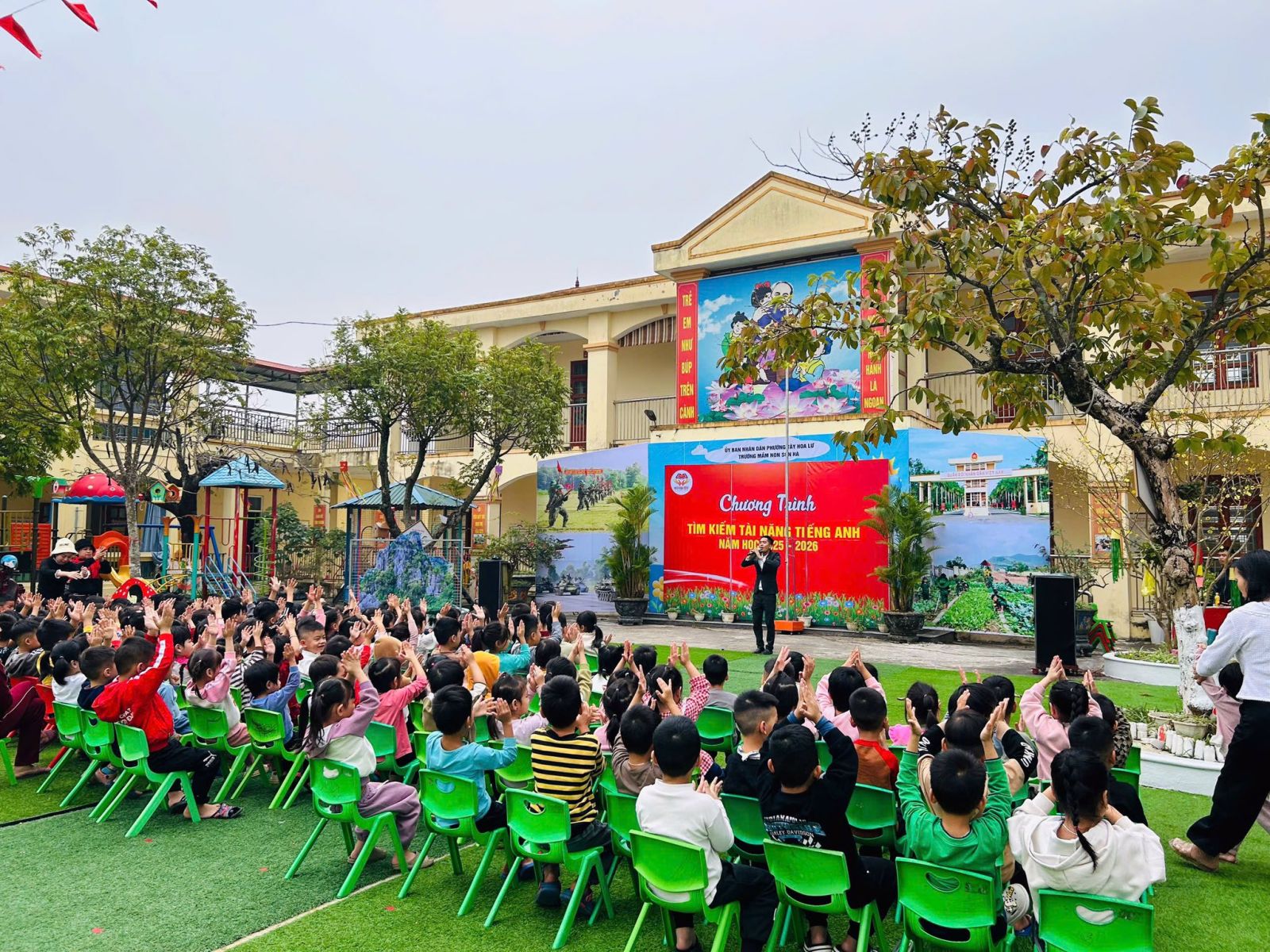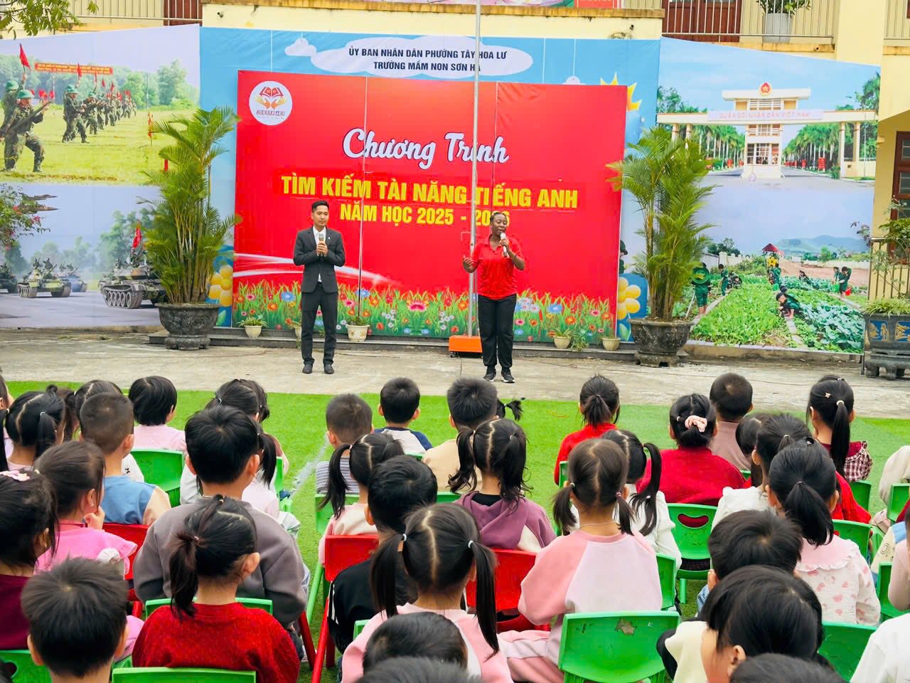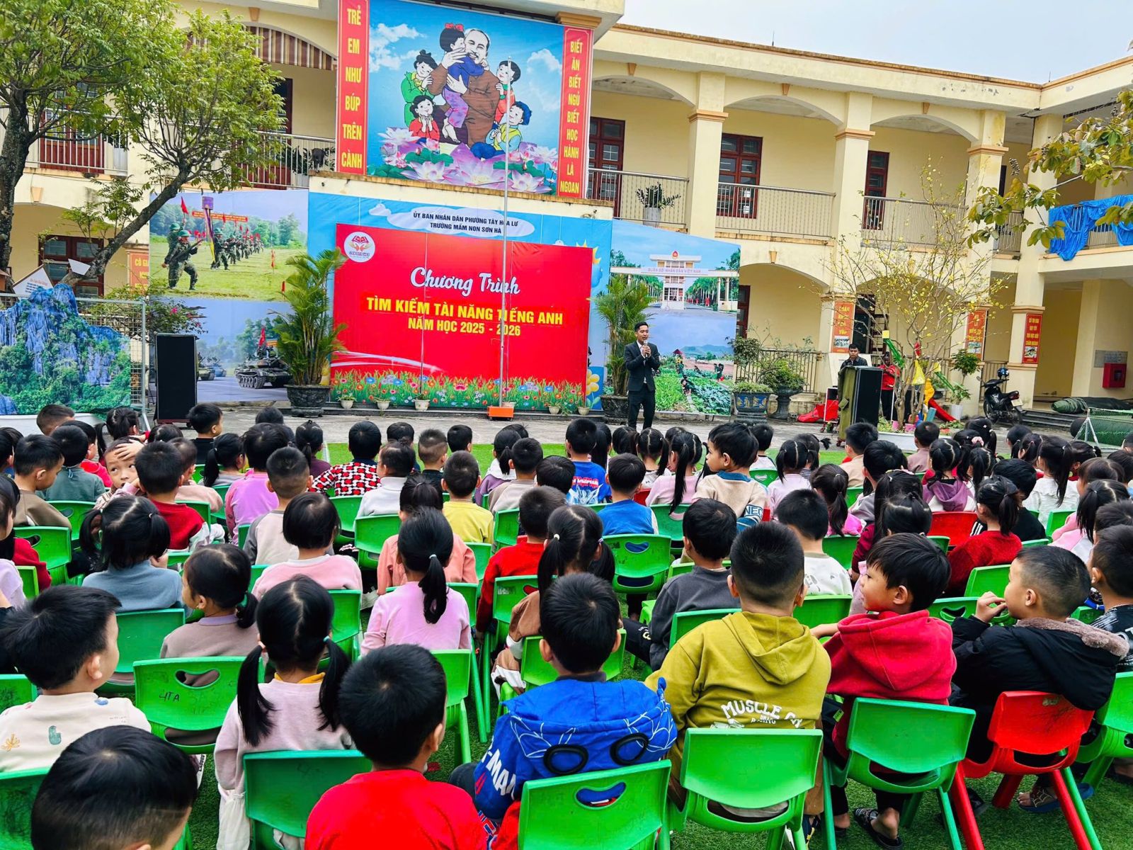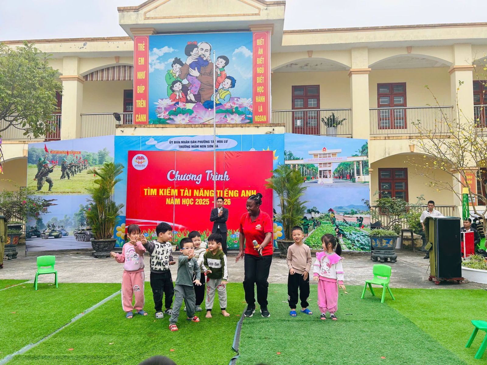 Trường Mầm non Sơn Hà đã kết hợp với trung tâm SUDULKI EDU tổ chức chương trình Tìm kiếm tài năng Tiếng Anh nhằm tạo sân chơi bổ ích, giúp trẻ làm quen và thể hiện khả năng sử dụng Tiếng Anh một cách tự nhiên, tự tin. Chương trình được xây dựng với nhiều hoạt động phong phú như hát Tiếng Anh, trả lời các câu hỏ bằng Tiếng Anh, giao tiếp đơn giản thông qua các trò chơi sinh động, phù hợp với lứa tuổi mầm non. Thông qua chương trình, nhà trường không chỉ phát hiện và bồi dưỡng những năng khiếu nổi bật của trẻ mà còn góp phần khơi dậy niềm yêu thích học Tiếng Anh, phát triển kỹ năng giao tiếp, sự mạnh dạn và sáng tạo. Đây cũng là dịp để tăng cường sự phối hợp giữa nhà trường, giáo viên và phụ huynh trong việc chăm sóc, giáo dục và phát triển toàn diện cho trẻ.