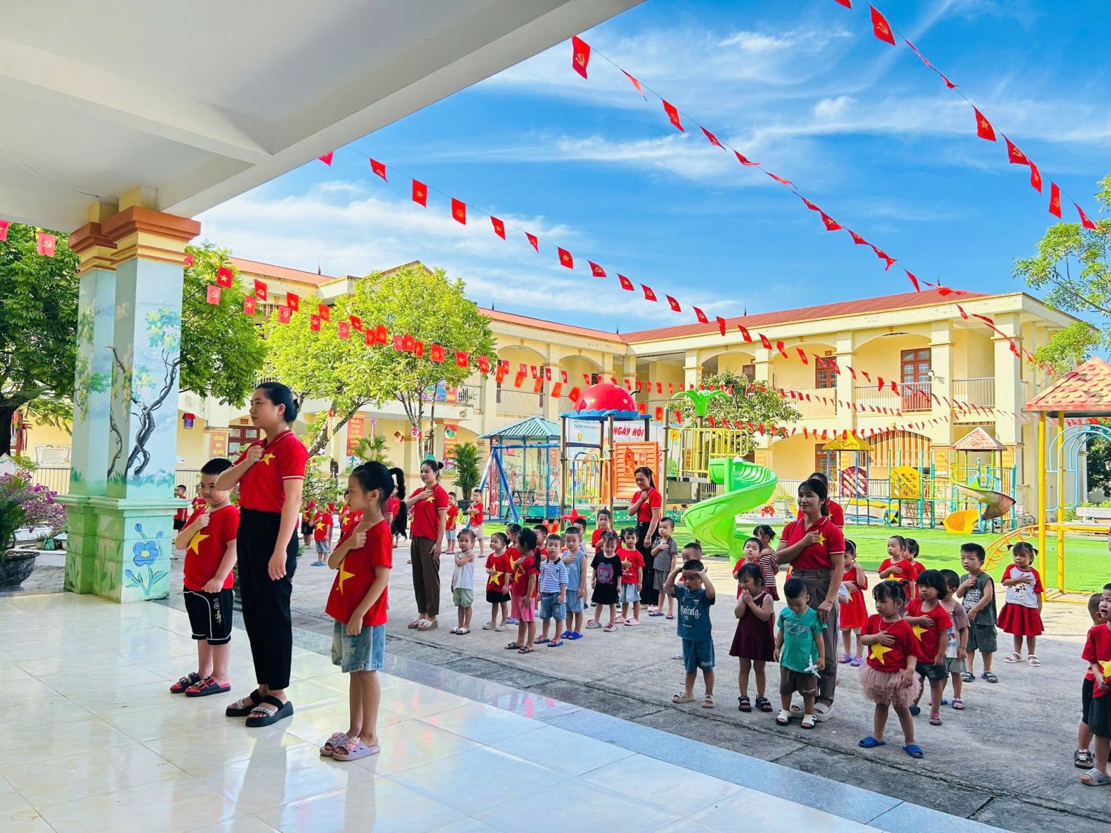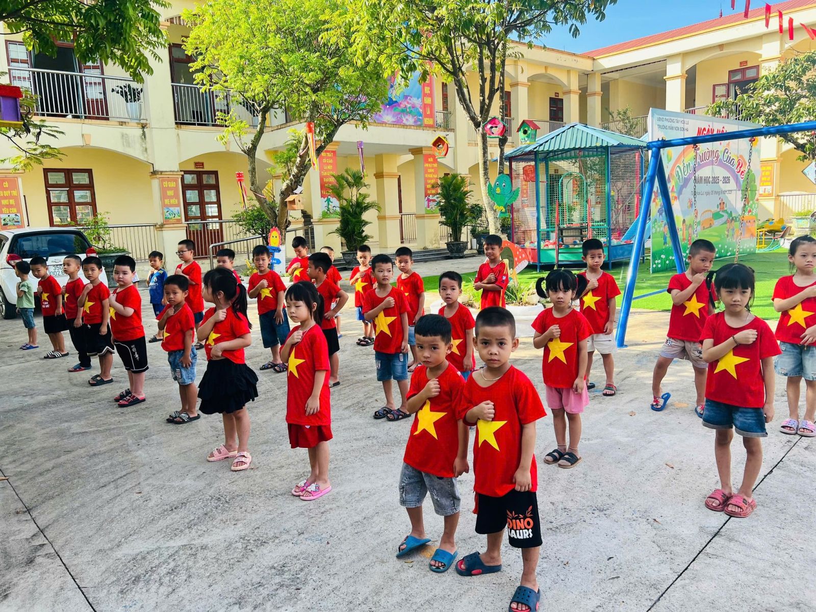 Tại Trường Mầm non Sơn Hà, các bé cùng cô giáo thực hiện nghi thức chào cờ đầu tuần trong không khí trang nghiêm mà đầy thân thương.